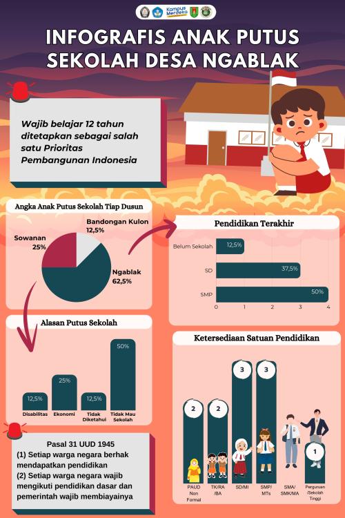 Selain ditujukan bagi pegawai kantor desa, program ini juga menyasar masyarakat luas. Masyarakat yang berkunjung ke kantor Desa Ngablak dapat melihat poster infografis terkait anak putus sekolah dan mendapatkan pemahaman yang lebih baik mengenai isu ini. Penulis berharap dengan adanya dashboard visualisasi menggunakan Excel dan poster infografis, Desa Ngablak dapat terus memperbarui data anak putus sekolah secara rapi dan informatif