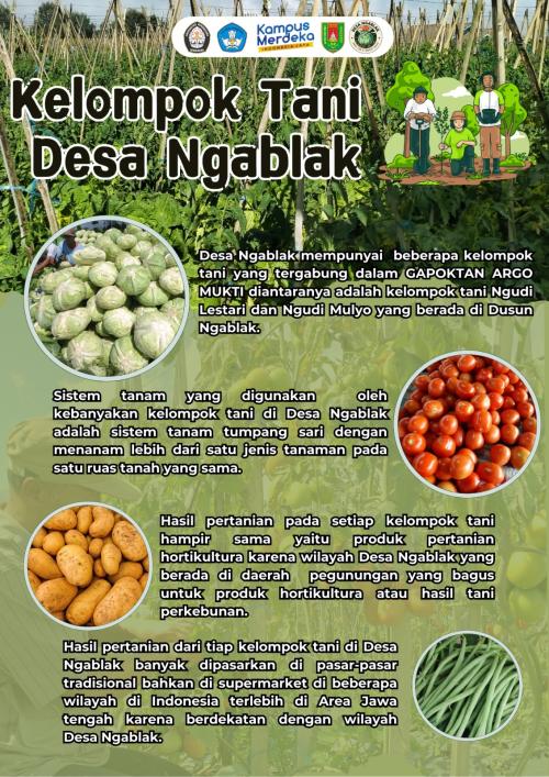 Dikenalnya potensi pertanian di Desa Ngablak tidak serta merta membuat informasi tentang pertanian, kelompok tani dan gapoktan di Desa Ngablak tersedia untuk masyarakat umum. Hal ini yang menjadi cikal bakal dibuatnya poster profil singkat Kelompok Tani Desa Ngablak oleh Mahasiswa KKN Tim II Universitas Diponegoro 2024, dengan tidak adanya profil kelompok tani desa membuat potensi pertanian di Desa Ngablak kurang bisa dimaksimalkan karena kurangnya informasi yang bisa diakses oleh wisatawan yang berwisata di Desa Ngablak.